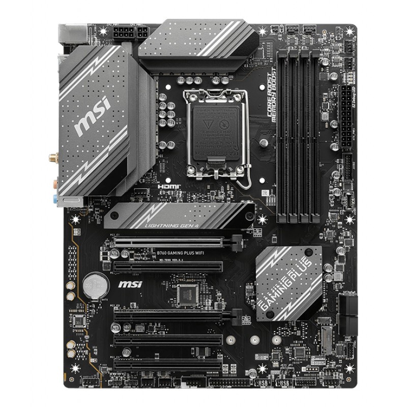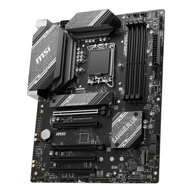 MSI B760 GAMING PLUS WIFI. Fabricant de processeur: Intel, Socket de processeur (réceptable de processeur): LGA 1700, Processeurs compatibles: Intel® Celeron®, Intel® Pentium® Gold. Types de mémoire pris en charge: DDR5-SDRAM, Mémoire interne maximale: 192 Go, Type de support (slot): DIMM. Interfaces de lecteur de stockage prises en charge: M.2, SATA, Niveaux RAID: 0, 1, 5, 10. Type d'interface Ethernet: 2.5 Gigabit Ethernet, Contrôleur de réseau local (LAN): Dragon RTL8125BG, Norme Wi-Fi: Wi-Fi 6E (802.11ax). composant pour: PC, Elément de forme de carte mère: ATX, famille de composant de produits: Intel