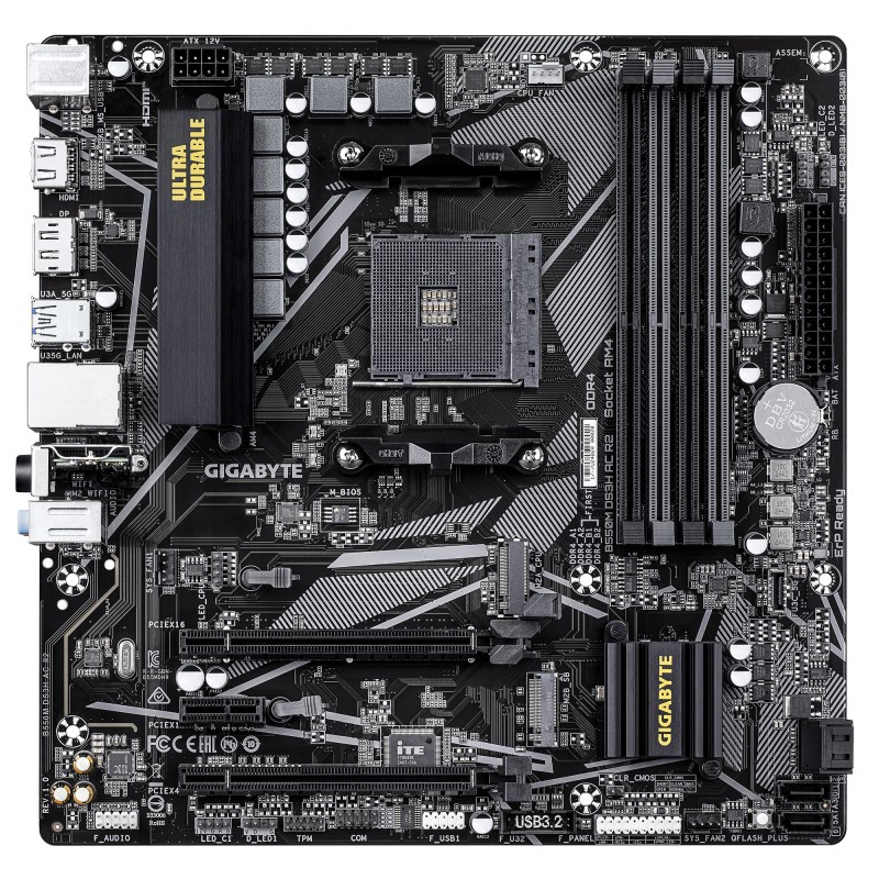 GIGABYTE B550M DS3H AC R2 Carte mère - Processeurs AMD Ryzen 5000, VRM 5+3 phases, jusqu'à 4733 MHz DDR4 (O.C.), 1x M.2 PCIe 4.0 + 1x M.2 PCIe 3.0, Wi-Fi 5, LAN 1 GbE, USB 3.2 Gen 1. Fabricant de processeur: AMD, Socket de processeur (réceptable de processeur): Emplacement AM4, Processeurs compatibles: AMD Ryzen 3000 Series, AMD Ryzen 4000 Series, AMD Ryzen 5000 Series. Types de mémoire pris en charge: DDR4-SDRAM, Mémoire interne maximale: 128 Go, Type de support (slot): DIMM. Interfaces de lecteur de stockage prises en charge: M.2, PCI Express 3.0, PCI Express 4.0, SATA III, Types de lecteurs de stockage pris en charge: HDD & SSD, Niveaux RAID: 0, 1, 10. Résolution maximale: 5120 x 2880 pixels. Type d'interface Ethernet: Gigabit Ethernet, Contrôleur de réseau local (LAN): Realtek RTL8111H, Norme Wi-Fi: Wi-Fi 5 (802.11ac)