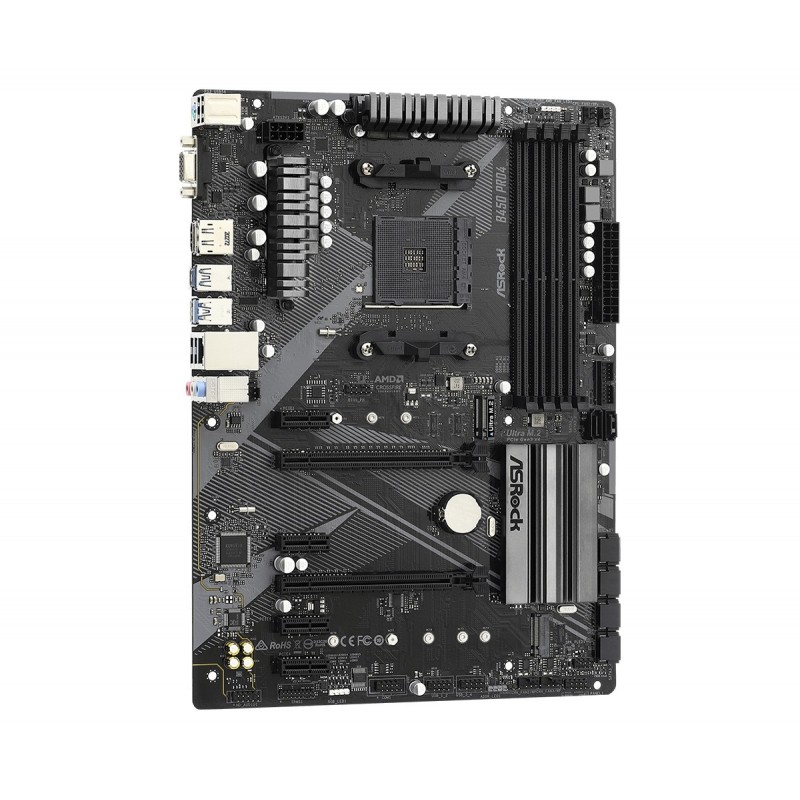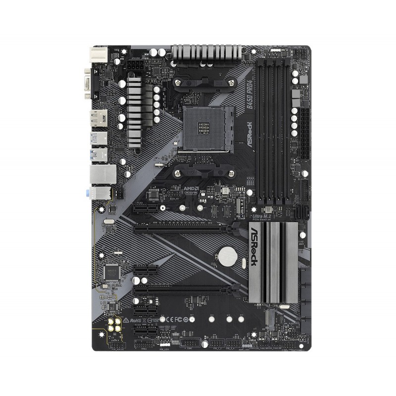 Asrock B450 Pro4 R2.0. Fabricant de processeur: AMD, Socket de processeur (réceptable de processeur): Emplacement AM4, Processeurs compatibles: AMD Athlon, AMD Ryzen 3000 Series, AMD Ryzen 5000 Series. Types de mémoire pris en charge: DDR4-SDRAM, Mémoire interne maximale: 128 Go, Type de support (slot): DIMM. Interfaces de lecteur de stockage prises en charge: M.2, SATA III, Niveaux RAID: 0, 1, 10. Technologie de Traitement en parallèle: CrossFireX, Quad-GPU CrossFireX, Résolution maximale: 4096 x 2160 pixels. Type d'interface Ethernet: Gigabit Ethernet, Contrôleur de réseau local (LAN): Realtek RTL8111H
