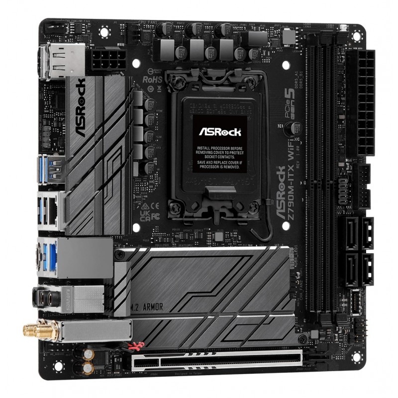 Asrock Z790M-ITX WiFi. Fabricant de processeur: Intel, Socket de processeur (réceptable de processeur): LGA 1700, Processeurs compatibles: Intel® Core™ i5, Intel® Core™ i7, Intel® Core™ i9. Types de mémoire pris en charge: DDR5-SDRAM, Mémoire interne maximale: 64 Go, Type de support (slot): DIMM. Interfaces de lecteur de stockage prises en charge: M.2, SATA III, Types de lecteurs de stockage pris en charge: HDD & SSD, Niveaux RAID: 0, 1, 5, 10. Type d'interface Ethernet: 2.5 Gigabit Ethernet, Norme Wi-Fi: Wi-Fi 6E (802.11ax), Standards wifi: 802.11a, 802.11b, 802.11g, Wi-Fi 4 (802.11n), Wi-Fi 5 (802.11ac), Wi-Fi 6E (802.11ax). composant pour: PC, Elément de forme de carte mère: mini ITX, famille de composant de produits: Intel