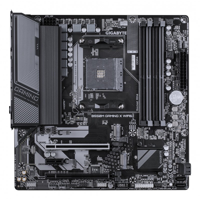 GIGABYTE B550M GAMING X WIFI6 Carte mère - Processeurs AMD Ryzen 5000, VRM 5+3 phases, jusqu'à 3200 MHz DDR4, 1x M.2 PCIe 4.0 + 1x M.2 PCIe 3.0, Wi-Fi 6, LAN 1 GbE, USB 3.2 Gen 1. Fabricant de processeur: AMD, Socket de processeur (réceptable de processeur): Emplacement AM4, Processeurs compatibles: AMD Ryzen 3000 Series, AMD Ryzen 4000 Series, AMD Ryzen 5000 Series. Types de mémoire pris en charge: DDR4-SDRAM, Mémoire interne maximale: 128 Go, Type de support (slot): DIMM. Interfaces de lecteur de stockage prises en charge: M.2, PCI Express 3.0, PCI Express 4.0, SATA III, Types de lecteurs de stockage pris en charge: HDD & SSD, Niveaux RAID: 0, 1, 10. Résolution maximale: 5120 x 2880 pixels. Type d'interface Ethernet: Gigabit Ethernet, Contrôleur de réseau local (LAN): Realtek RTL8111H, Norme Wi-Fi: Wi-Fi 6 (802.11ax)