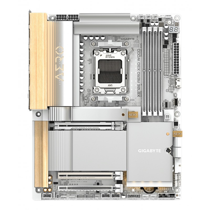 • Gigabyte X870E AERO X3D WOOD Carte Mère - Prend en charge les processeurs AMD Ryzen 9000, VRM numérique 16+2+2 phases, jusqu’à 9000Hz DDR5 O.C., 2xPCIe 5.0 + 2xPCIe 4.0, Wi-Fi 7, LAN 5GbE, USB 4, AMD, Emplacement AM5, AMD Ryzen 7000 Series, AMD Ryzen