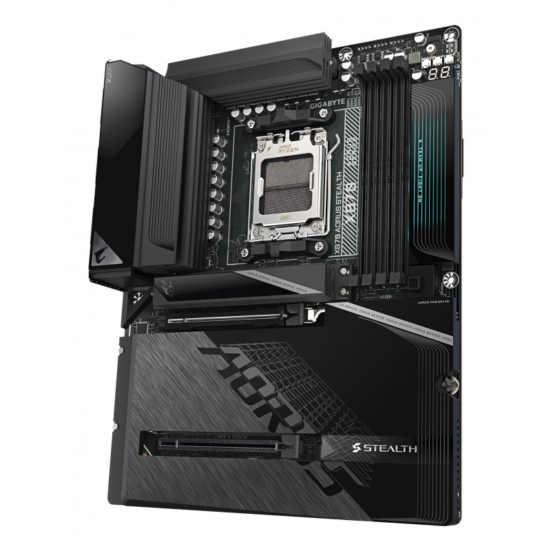GIGABYTE X870 AORUS STEALTH Carte Mère - Prend en charge les processeurs AMD Ryzen 9000, VRM numérique 16+2+2 phases, jusqu’à 8200MHz DDR5 (O.C.), 2xPCIe 5.0 + 2xPCIe 4.0, Wi-Fi 7, LAN 5GbE, USB 4. Fabricant de processeur: AMD, Socket de processeur (réceptable de processeur): Emplacement AM5, Processeurs compatibles: AMD Ryzen 7000 Series, AMD Ryzen 8000 Series, AMD Ryzen 9000 Series. Types de mémoire pris en charge: DDR5-SDRAM, Mémoire interne maximale: 256 Go, Type de support (slot): DIMM. Interfaces de lecteur de stockage prises en charge: M.2, PCI Express 4.0, PCI Express 5.0, SATA III, Types de lecteurs de stockage pris en charge: HDD & SSD, Niveaux RAID: 0, 1, 5, 10. Résolution maximale: 4096 x 2160 pixels. Type d'interface Ethernet: 2.5 Gigabit Ethernet, 5 Gigabit Ethernet, Fast Ethernet, Gigabit Ethernet, Contrôleur de réseau local (LAN): Realtek RTL8126, Norme Wi-Fi: Wi-Fi 7 (802.11be)