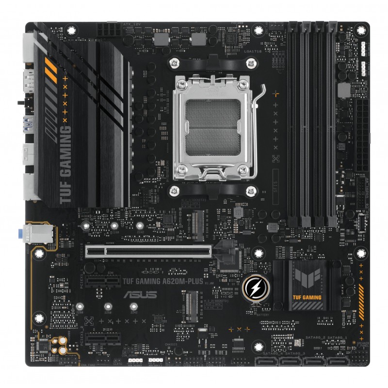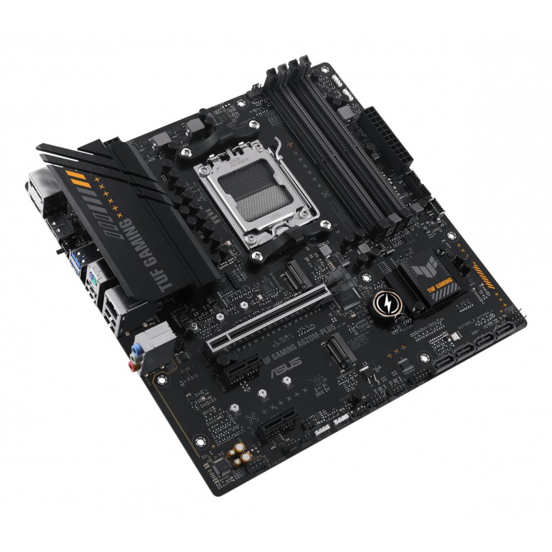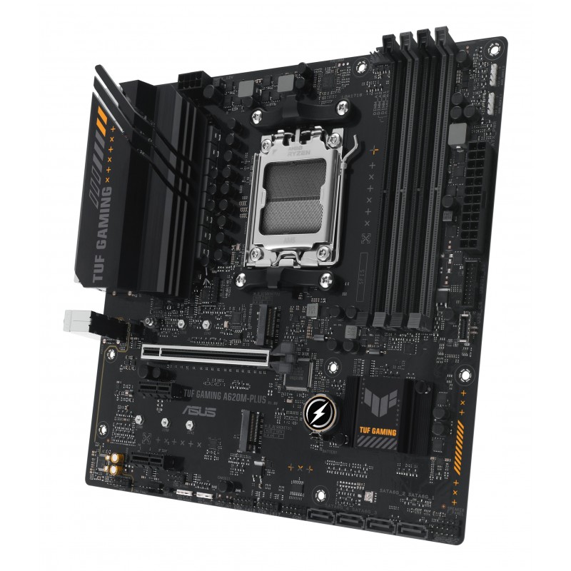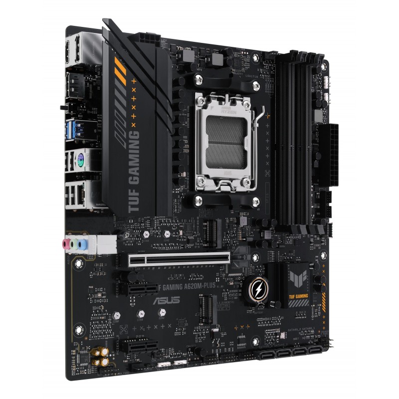 ASUS TUF GAMING A620M-PLUS. Fabricant de processeur: AMD, Socket de processeur (réceptable de processeur): Emplacement AM5, Processeurs compatibles: AMD Ryzen 7000 Series. Types de mémoire pris en charge: DDR5-SDRAM, Mémoire interne maximale: 128 Go, Type de support (slot): DIMM. Interfaces de lecteur de stockage prises en charge: M.2, SATA III, Types de lecteurs de stockage pris en charge: HDD & SSD, Niveaux RAID: 0, 1, 10. Type d'interface Ethernet: 2.5 Gigabit Ethernet. composant pour: PC, Elément de forme de carte mère: micro ATX, famille de composant de produits: AMD