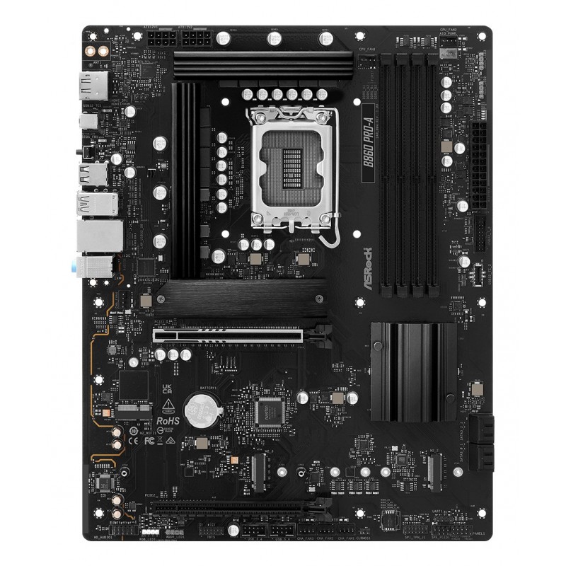 Asrock B860 Pro-A. Fabricant de processeur: Intel, Socket de processeur (réceptable de processeur): LGA 1851 (Socket V1). Types de mémoire pris en charge: DDR5-SDRAM, Mémoire interne maximale: 256 Go, Type de support (slot): DIMM. Interfaces de lecteur de stockage prises en charge: M.2, SATA III, Niveaux RAID: 0, 1, 10. Famille d'adaptateur graphique: Intel, Adaptateur graphique: Intel® UHD Graphics. Type d'interface Ethernet: 2.5 Gigabit Ethernet, Contrôleur de réseau local (LAN): Dragon RTL8125BG