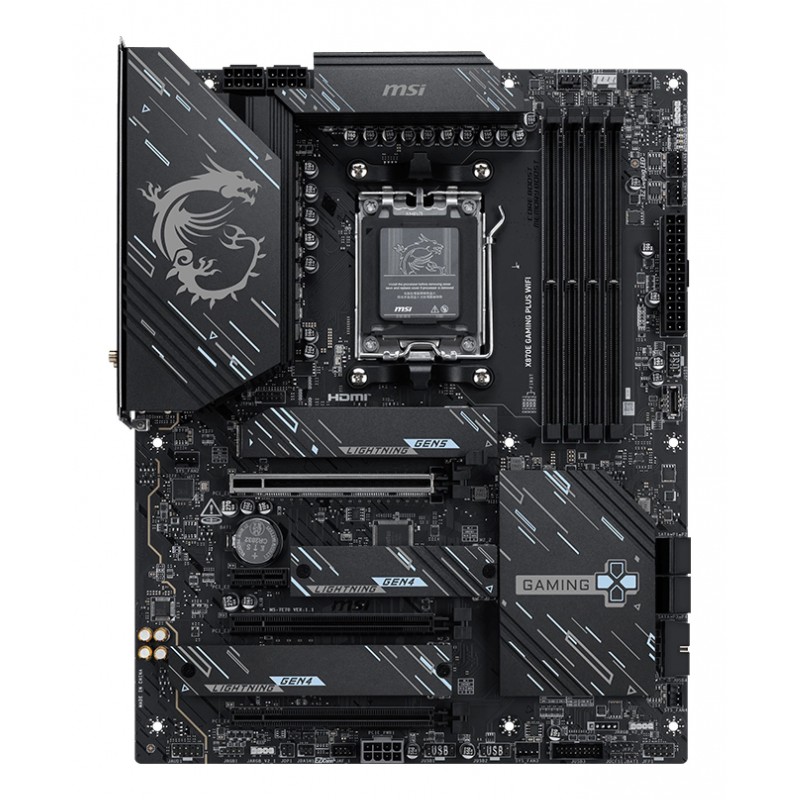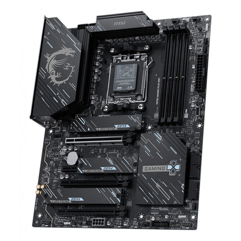 MSI X870E GAMING PLUS WIFI. Fabricant de processeur: AMD, Socket de processeur (réceptable de processeur): Emplacement AM5, Processeurs compatibles: AMD Ryzen 7000 Series, AMD Ryzen 8000 Series, AMD Ryzen 9000 Series. Types de mémoire pris en charge: DDR5-SDRAM, Mémoire interne maximale: 256 Go, Type de support (slot): DIMM. Types de lecteurs de stockage pris en charge: HDD, Niveaux RAID: 0, 1, 5, 10. Résolution maximale: 3840 x 2160 pixels. Type d'interface Ethernet: 5 Gigabit Ethernet, Norme Wi-Fi: Wi-Fi 7 (802.11be), Standards wifi: 802.11a, 802.11b, 802.11g, Wi-Fi 4 (802.11n), Wi-Fi 5 (802.11ac), Wi-Fi 6 (802.11ax), Wi-Fi 6E...