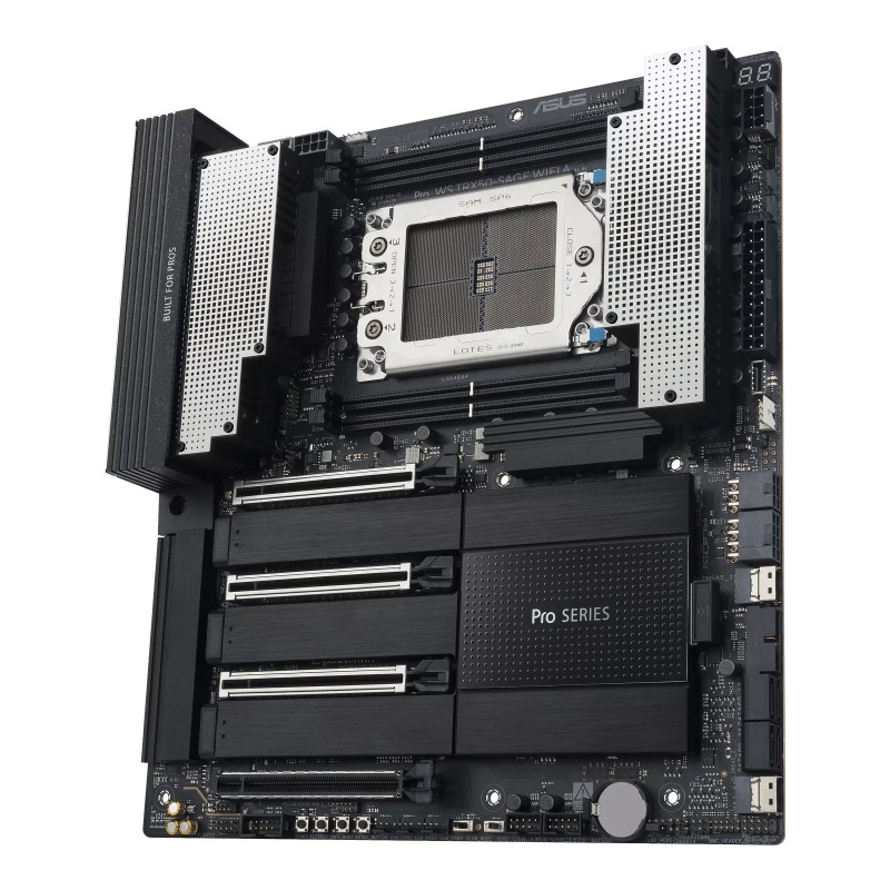 ASUS PRO WS TRX50-SAGE WIFI A. Fabricant de processeur: AMD, Socket de processeur (réceptable de processeur): Socket sTR5, Processeurs compatibles: AMD Ryzen Threadripper 7000 Series, AMD Ryzen Threadripper PRO 7000 WX-Series. Types de mémoire pris en charge: DDR5-SDRAM, Type de support (slot): DIMM, Canaux de mémoire: Double canal. Interfaces de lecteur de stockage prises en charge: M.2, SATA III, SlimSAS, Types de lecteurs de stockage pris en charge: HDD & SSD, Niveaux RAID: 0, 1, 5, 10. Type d'interface Ethernet: 2.5 Gigabit Ethernet, 10 Gigabit Ethernet, Contrôleur de réseau local (LAN): Intel I226-LM, Norme Wi-Fi: Wi-Fi 7 (802.11be). composant pour: Station de travail, Elément de forme de carte mère: CEB, famille de composant de produits: AMD