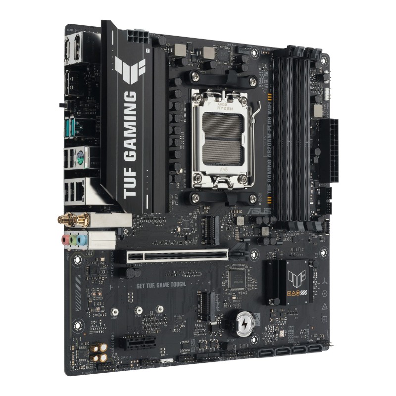 ASUS TUF GAMING A620AM-PLUS WIFI. Fabricant de processeur: AMD, Socket de processeur (réceptable de processeur): Emplacement AM5, Processeurs compatibles: AMD Ryzen 7000 Series, AMD Ryzen 8000 Series, AMD Ryzen 9000 Series. Types de mémoire pris en charge: DDR5-SDRAM, Mémoire interne maximale: 256 Go, Type de support (slot): DIMM. Interfaces de lecteur de stockage prises en charge: M.2, SATA III, Types de lecteurs de stockage pris en charge: HDD & SSD, Niveaux RAID: 0, 1, 5, 10. Type d'interface Ethernet: 2.5 Gigabit Ethernet, Norme Wi-Fi: Wi-Fi 6 (802.11ax), Standards wifi: Wi-Fi 6 (802.11ax). composant pour: PC, Elément de forme de carte mère: micro ATX, famille de composant de produits: AMD