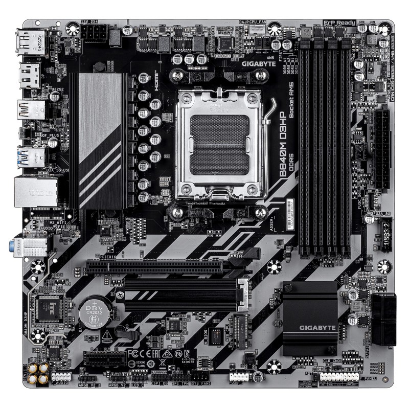 GIGABYTE B840M D3HP Carte Mère – Processeurs AMD Ryzen 9000, VRM 8+2+2 phases, jusqu’à 8200 MHz DDR5 (O.C.), 2× M.2 PCIe 4.0, LAN 1 GbE, USB 3.2 Gen 2. Fabricant de processeur: AMD, Socket de processeur (réceptable de processeur): Emplacement AM5, Processeurs compatibles: AMD Ryzen 7000 Series, AMD Ryzen 8000 Series, AMD Ryzen 9000 Series. Types de mémoire pris en charge: DDR5-SDRAM, Mémoire interne maximale: 256 Go, Type de support (slot): DIMM. Interfaces de lecteur de stockage prises en charge: M.2, PCI Express 4.0, SATA III, Types de lecteurs de stockage pris en charge: HDD & SSD, Niveaux RAID: 0, 1, 10, 5. Résolution maximale: 4096 x 2160 pixels. Type d'interface Ethernet: Gigabit Ethernet, Contrôleur de réseau local (LAN): Realtek RTL8111H