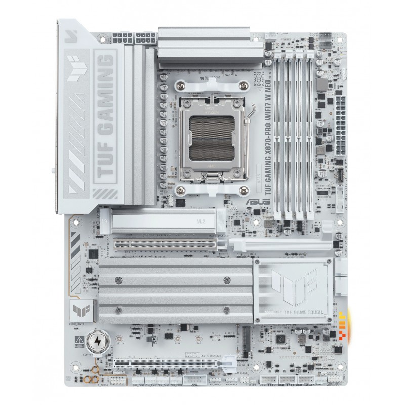 ASUS TUF GAMING X870-PRO WIFI7 W NEO. Fabricant de processeur: AMD, Socket de processeur (réceptable de processeur): Emplacement AM5, Processeurs compatibles: AMD Ryzen 9000 Series, AMD Ryzen 8000 Series, AMD Ryzen 7000 Series. Types de mémoire pris en charge: DDR5-SDRAM, Mémoire interne maximale: 256 Go, Type de support (slot): DIMM. Interfaces de lecteur de stockage prises en charge: M.2, SATA III, Types de lecteurs de stockage pris en charge: HDD & SSD, Niveaux RAID: 0, 1, 5, 10. Type d'interface Ethernet: 5 Gigabit Ethernet, Norme Wi-Fi: Wi-Fi 7 (802.11be), Standards wifi: Wi-Fi 7 (802.11be). composant pour: PC, Elément de forme de carte mère: ATX, famille de composant de produits: AMD