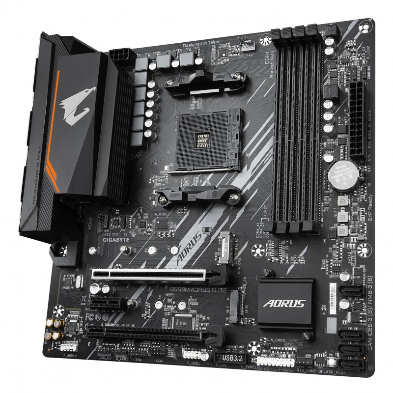 GIGABYTE B550M AORUS ELITE Carte mère - Processeurs AMD Ryzen 5000, VRM 5+3 phases, jusqu'à 4733 MHz DDR4, 1xPCIe 4.0 + 1xPCIe 3.0 M.2, LAN 1GbE, USB 3.2 Gen 1. Fabricant de processeur: AMD, Socket de processeur (réceptable de processeur): Emplacement AM4, Processeurs compatibles: AMD Ryzen 3000 Series, AMD Ryzen 4000 Series, AMD Ryzen 5000 Series. Types de mémoire pris en charge: DDR4-SDRAM, Mémoire interne maximale: 128 Go, Type de support (slot): DIMM. Interfaces de lecteur de stockage prises en charge: M.2, SATA III, Types de lecteurs de stockage pris en charge: HDD & SSD, Niveaux RAID: 0, 1, 10. Résolution maximale: 4096 x 2160 pixels. Type d'interface Ethernet: Gigabit Ethernet, Contrôleur de réseau local (LAN): Realtek RTL8111H