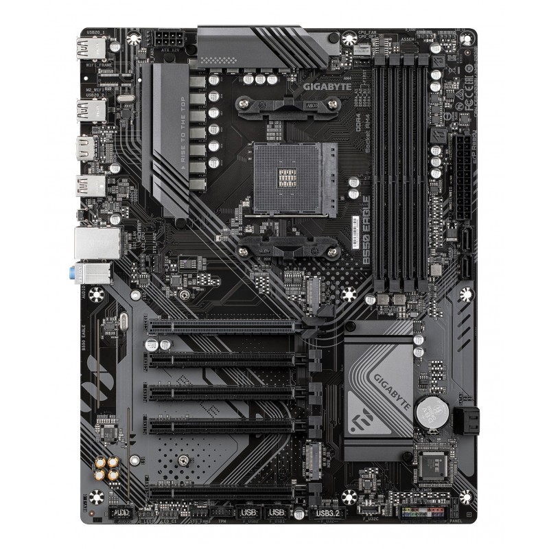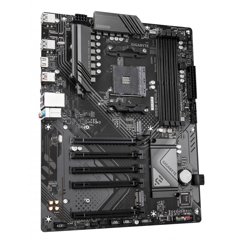 GIGABYTE B550 EAGLE Carte mère - Processeurs AMD Ryzen série 5000 G, VRM 10+3+1 phases, jusqu'à 3200 MHz DDR4, 1xPCIe 4.0 + 1xPCIe 3.0 M.2, LAN 1GbE, USB 3.2 Gen 2. Fabricant de processeur: AMD, Socket de processeur (réceptable de processeur): Emplacement AM4, Processeurs compatibles: AMD Ryzen 3000 Series, AMD Ryzen 4000 Series, AMD Ryzen 5000 Series. Types de mémoire pris en charge: DDR4-SDRAM, Mémoire interne maximale: 128 Go, Type de support (slot): DIMM. Interfaces de lecteur de stockage prises en charge: M.2, PCI Express 4.0, SATA III, Types de lecteurs de stockage pris en charge: HDD & SSD, Niveaux RAID: 0, 1, 10. Résolution maximale: 4096 x 2160 pixels. Type d'interface Ethernet: Gigabit Ethernet, Contrôleur de réseau local (LAN): Realtek RTL8111H