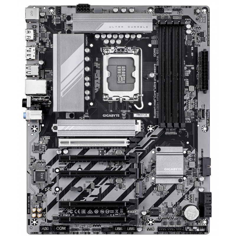 GIGABYTE B860 DS3H WIFI6E Carte mère - Processeurs Intel Core Ultra, VRM 8+1+2+2 phases, jusqu'à 9066MHz DDR5, 1xPCIe 5.0 + 1xPCIe 4.0 M.2, LAN 2,5 GbE, WIFI 6E, USB 3.2 Gen 2x2. Fabricant de processeur: Intel, Socket de processeur (réceptable de processeur): LGA 1851 (Socket V1), Processeurs compatibles: Intel Core Ultra (Series 2). Types de mémoire pris en charge: DDR5-SDRAM, Mémoire interne maximale: 256 Go, Type de support (slot): DIMM. Interfaces de lecteur de stockage prises en charge: M.2, SATA III, Types de lecteurs de stockage pris en charge: HDD & SSD, Niveaux RAID: 0, 1, 5, 10. Résolution maximale: 4096 x 2160 pixels. Type d'interface Ethernet: 2.5 Gigabit Ethernet, Contrôleur de réseau local (LAN): Realtek RTL8125, Norme Wi-Fi: Wi-Fi 6E (802.11ax)