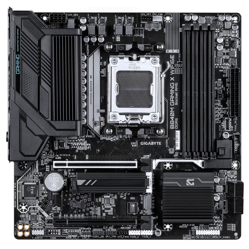 GIGABYTE B840M GAMING X WIFI6E Carte Mère – Processeurs AMD Ryzen 9000, VRM 8+2+2 phases, jusqu’à 8200 MHz DDR5 (O.C.), 2× M.2 PCIe 4.0, Wi-Fi 6E, LAN 2,5 GbE, USB 3.2 Gen 1. Fabricant de processeur: AMD, Socket de processeur (réceptable de processeur): Emplacement AM5, Processeurs compatibles: AMD Ryzen 7000 Series, AMD Ryzen 8000 Series, AMD Ryzen 9000 Series. Types de mémoire pris en charge: DDR5-SDRAM, Mémoire interne maximale: 256 Go, Type de support (slot): DIMM. Interfaces de lecteur de stockage prises en charge: M.2, PCI Express 4.0, SATA III, Types de lecteurs de stockage pris en charge: HDD & SSD, Niveaux RAID: 0, 1, 10, 5. Résolution maximale: 4096 x 2160 pixels. Type d'interface Ethernet: Gigabit Ethernet, Contrôleur de réseau local (LAN): Realtek RTL8125, Norme Wi-Fi: Wi-Fi 6E (802.11ax)