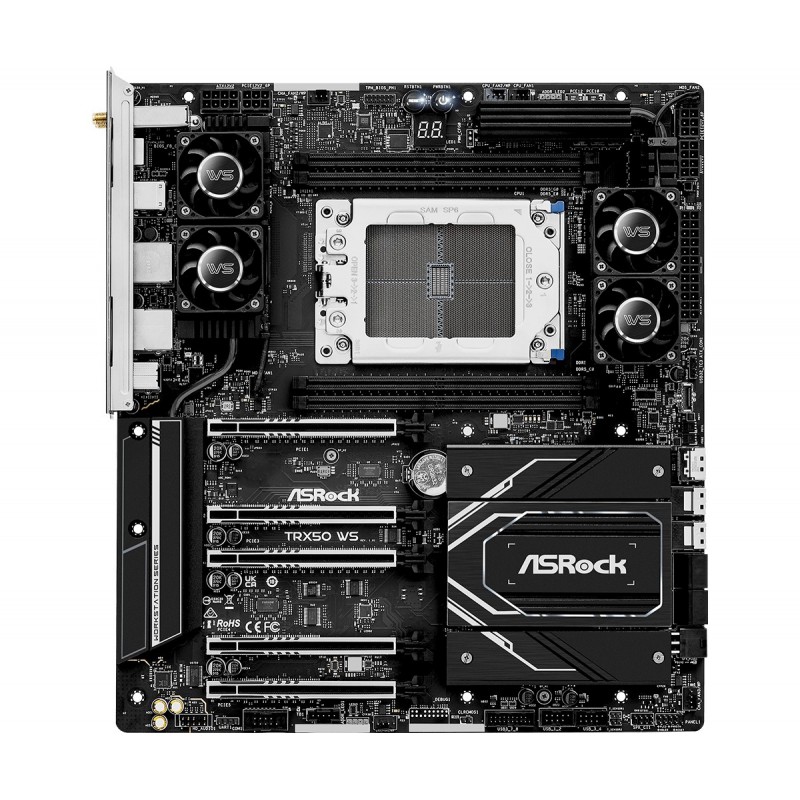 Asrock TRX50 WS. Fabricant de processeur: AMD, Socket de processeur (réceptable de processeur): Socket sTR5, Processeurs compatibles: AMD Ryzen Threadripper 1000 Series. Types de mémoire pris en charge: DDR5-SDRAM, Mémoire interne maximale: 1 To, Type de support (slot): DIMM. Interfaces de lecteur de stockage prises en charge: M.2, PCI Express 4.0, PCI Express 5.0, SATA III, Niveaux RAID: 0, 1, 10. Type d'interface Ethernet: 2.5 Gigabit Ethernet, 5 Gigabit Ethernet, 10 Gigabit Ethernet, Fast Ethernet, Gigabit Ethernet, Contrôleur de réseau local (LAN): Dragon RTL8125BG, Marvell AQtion AQC113C, Norme Wi-Fi: Wi-Fi 6E (802.11ax). composant pour: PC, Elément de forme de carte mère: ATX étendu, famille de composant de produits: AMD