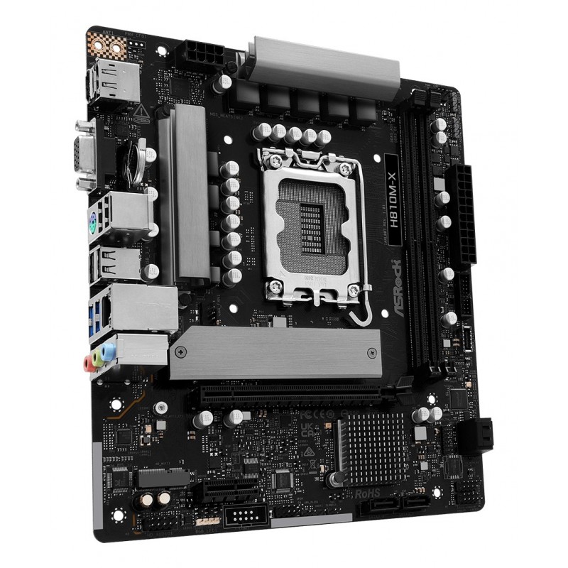 Asrock H810M-X. Fabricant de processeur: Intel, Socket de processeur (réceptable de processeur): LGA 1851 (Socket V1), Processeurs compatibles: Intel Core Ultra (Series 2). Types de mémoire pris en charge: DDR5-SDRAM, Mémoire interne maximale: 128 Go, Type de support (slot): DIMM. Interfaces de lecteur de stockage prises en charge: M.2, SATA III, Types de lecteurs de stockage pris en charge: HDD & SSD. Type d'interface Ethernet: 2.5 Gigabit Ethernet, Contrôleur de réseau local (LAN): Dragon RTL8125BG. composant pour: PC, Elément de forme de carte mère: micro ATX, famille de composant de produits: Intel
