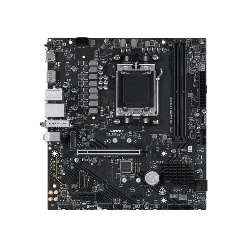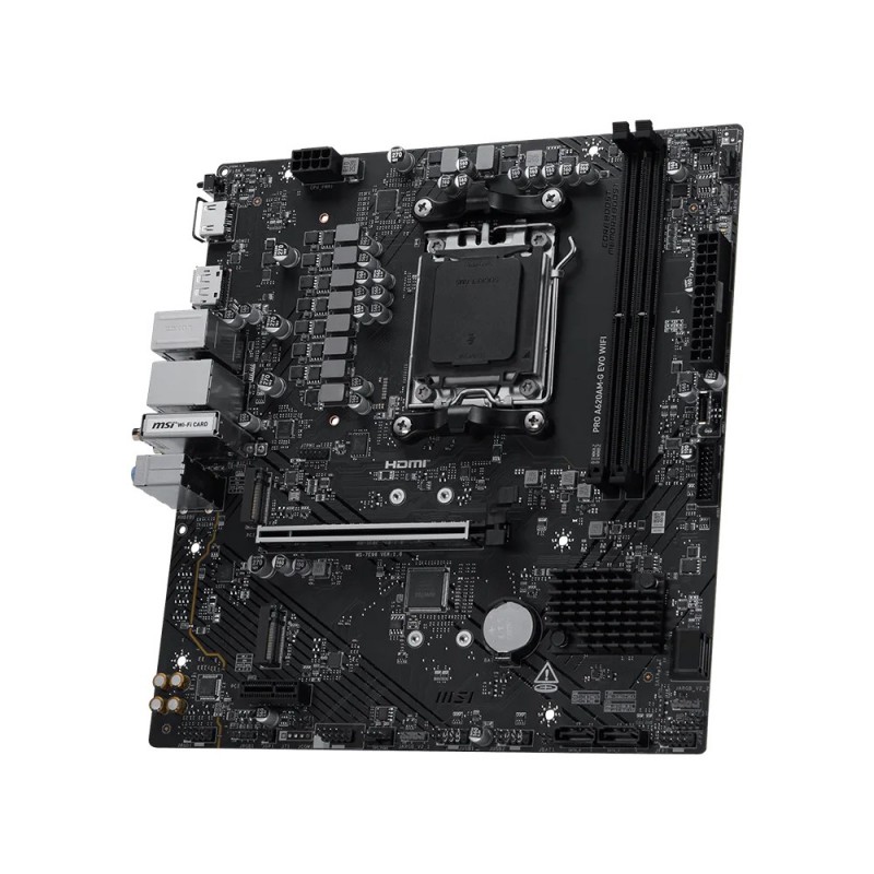 MSI Pro A620AM-G EVO WIFI. Fabricant de processeur: AMD, Socket de processeur (réceptable de processeur): Emplacement AM5, Processeurs compatibles: AMD Ryzen 7000 Series, AMD Ryzen 8000 Series, AMD Ryzen 9000 Series. Types de mémoire pris en charge: DDR5-SDRAM, Mémoire interne maximale: 128 Go, Type de support (slot): DIMM. Interfaces de lecteur de stockage prises en charge: M.2, SATA III, Niveaux RAID: 0, 1, 10. Type d'interface Ethernet: 2.5 Gigabit Ethernet, Norme Wi-Fi: Wi-Fi 6E (802.11ax), Standards wifi: Wi-Fi 6E (802.11ax), 802.11a, 802.11b, 802.11g, Wi-Fi 4 (802.11n), Wi-Fi 5 (802.11ac). composant pour: PC, Elément de forme de carte mère: micro ATX, famille de composant de produits: AMD