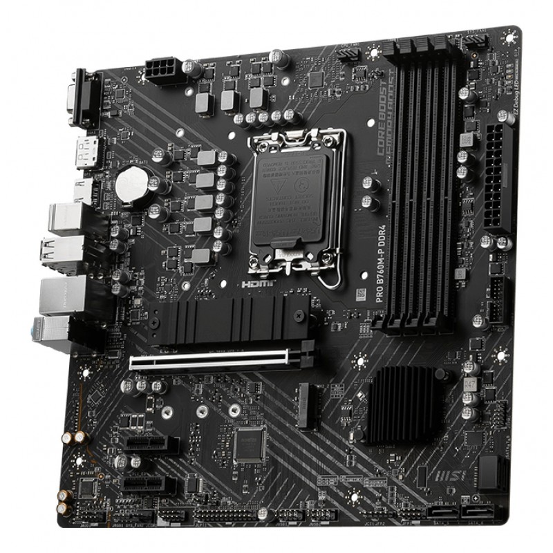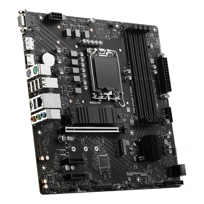 MSI PRO B760M-P DDR4. Fabricant de processeur: Intel, Socket de processeur (réceptable de processeur): LGA 1700, Processeurs compatibles: Intel® Celeron®, Intel® Pentium® Gold. Types de mémoire pris en charge: DDR4-SDRAM, Mémoire interne maximale: 128 Go, Type de support (slot): DIMM. Interfaces de lecteur de stockage prises en charge: M.2, SATA III, Niveaux RAID: 0, 1, 5, 10. Type d'interface Ethernet: 2.5 Gigabit Ethernet. composant pour: PC, Elément de forme de carte mère: micro ATX, famille de composant de produits: Intel