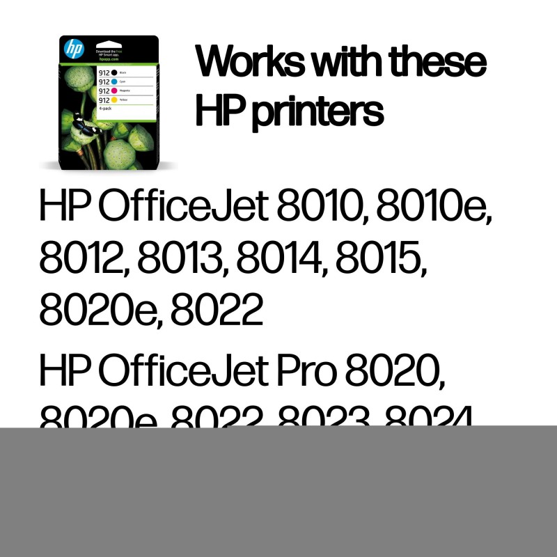 HP 912 ink cartridges work with: HP OfficeJet 8010e, 8012, 8014, 8015 HP OfficeJet Pro 8020e, 8022, 8023, 8024, 8025