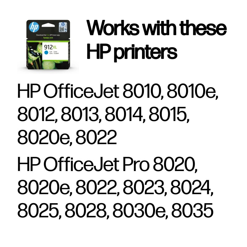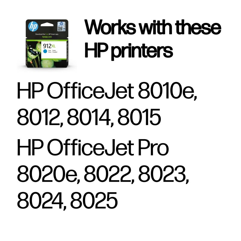 HP 912 ink cartridges work with: HP OfficeJet 8010e, 8012, 8014, 8015 HP OfficeJet Pro 8020e, 8022, 8023, 8024, 8025
