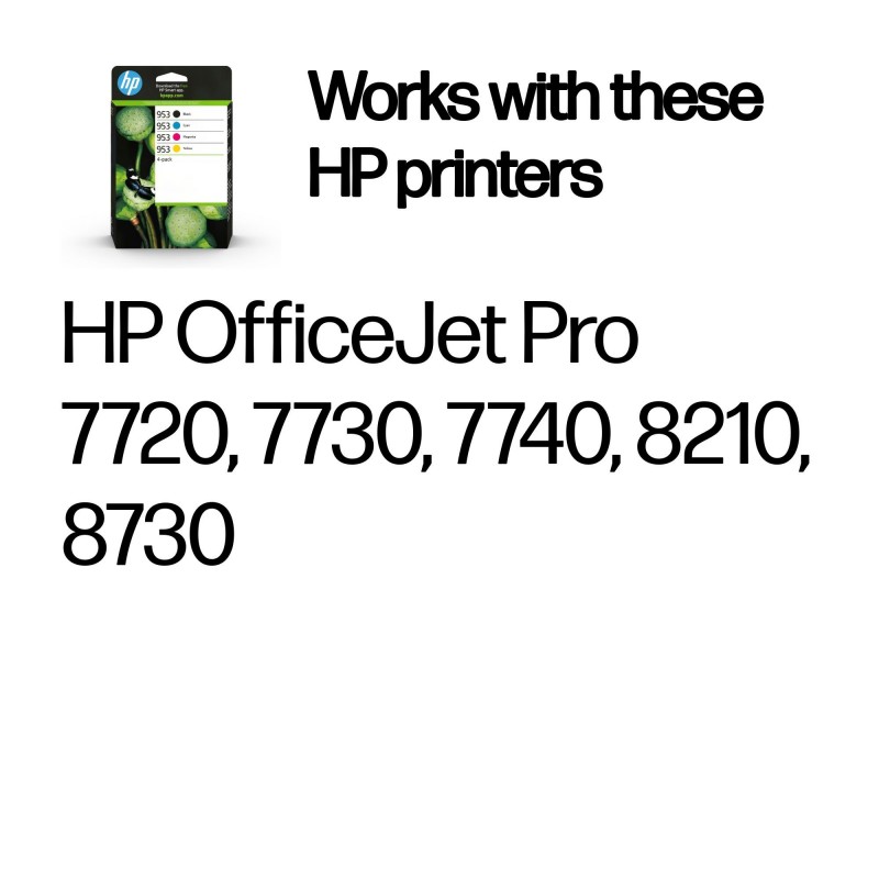HP 953 ink cartridges work with: HP OfficeJet Pro 7720, 7730, 7740, 8210, 8720, 8730