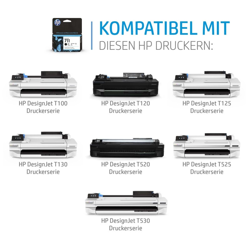• HP 711 cartouche d'encre DesignJet noir, 80 ml, Gamme d’imprimantes HP DesignJet T100, T120, T125, T130, T520, T525, T530, A jet d'encre thermique, Noir, CZ133A, Singapour, Malaisie, 119 mm