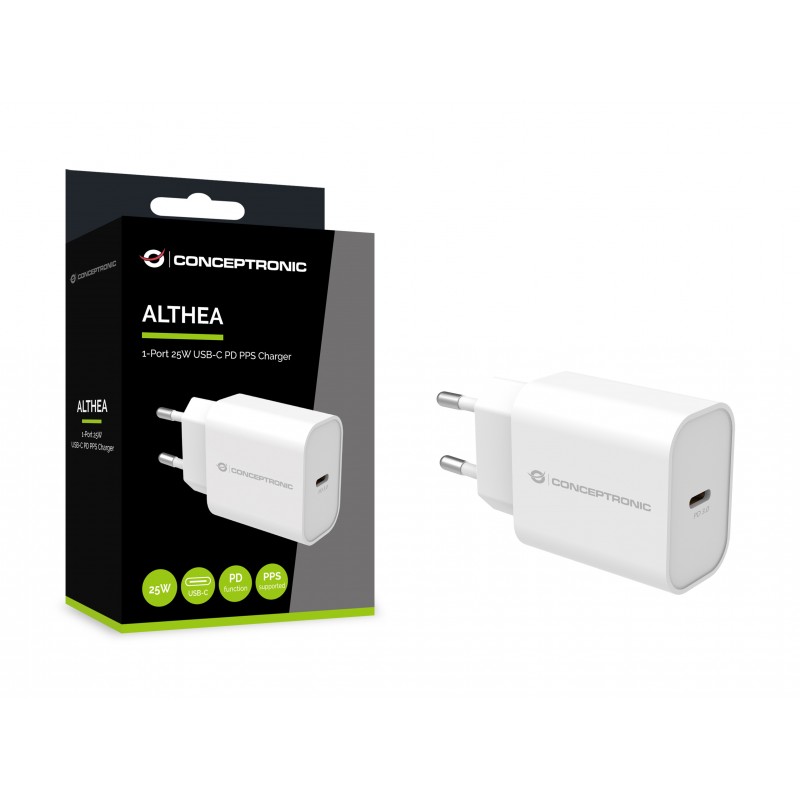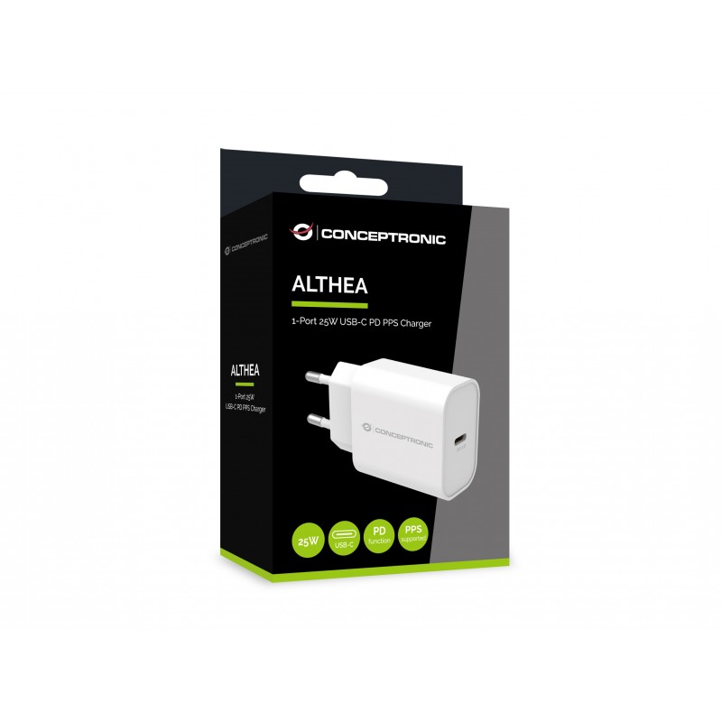 Conceptronic ALTHEA10W. Type de chargeur: Intérieure, Type de source d'alimentation: Secteur, Compatibilité de chargeur: Universel. Tension d'entrée: 100 - 240 V, Tension de sortie (max): 3,3 V. Quantité de ports USB de type C: 1, Charge rapide, Dispositifs de protection électrique: Surchauffe, Surcharge, Court-circuit. Couleur du produit: Blanc