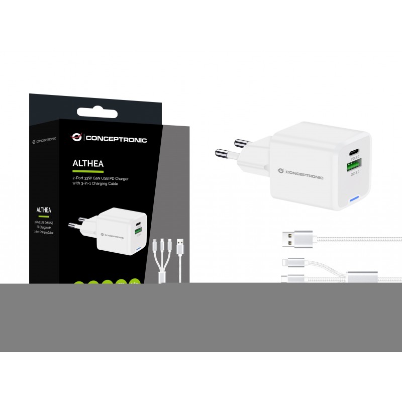 Conceptronic ALTHEA16W. Type de chargeur: Intérieure, Type de source d'alimentation: Secteur, Compatibilité de chargeur: Universel. Tension d'entrée: 100 - 240 V, Tension de sortie (max): 20 V. Quantité de ports USB de type C: 1, Charge rapide, Dispositifs de protection électrique: Surchauffe, Surcharge, Court-circuit. Longueur de câble: 1,5 m, Couleur du produit: Blanc