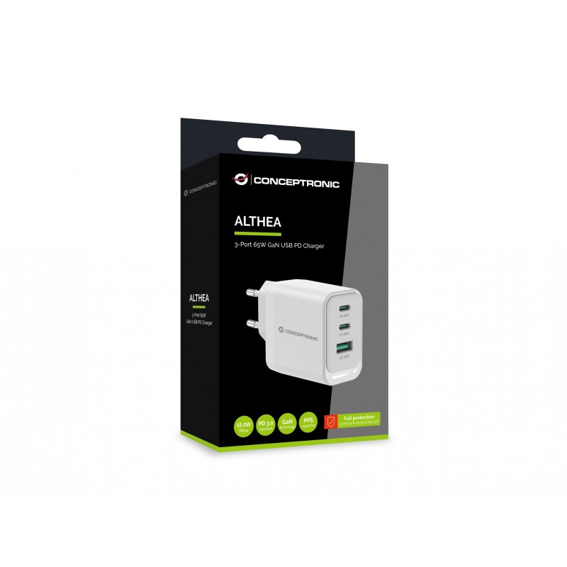 Conceptronic ALTHEA21W65. Type de chargeur: Intérieure, Type de source d'alimentation: Secteur, Compatibilité de chargeur: Universel. Tension d'entrée: 100 - 240 V, Tension de sortie (max): 20 V. Quantité de ports USB de type C: 2, Charge rapide, Dispositifs de protection électrique: Surchauffe, Surcharge, Court-circuit. Longueur de câble: 1,5 m, Couleur du produit: Blanc