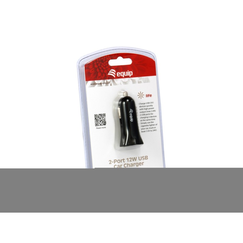 Equip 245510. Type de chargeur: Auto, Type de source d'alimentation: Allume-cigare, Compatibilité de chargeur: Universel. Tension d'entrée: 12/24 V, Tension de sortie (max): 5 V. Quantité de Ports USB 2.0: 2. Couleur du produit: Noir