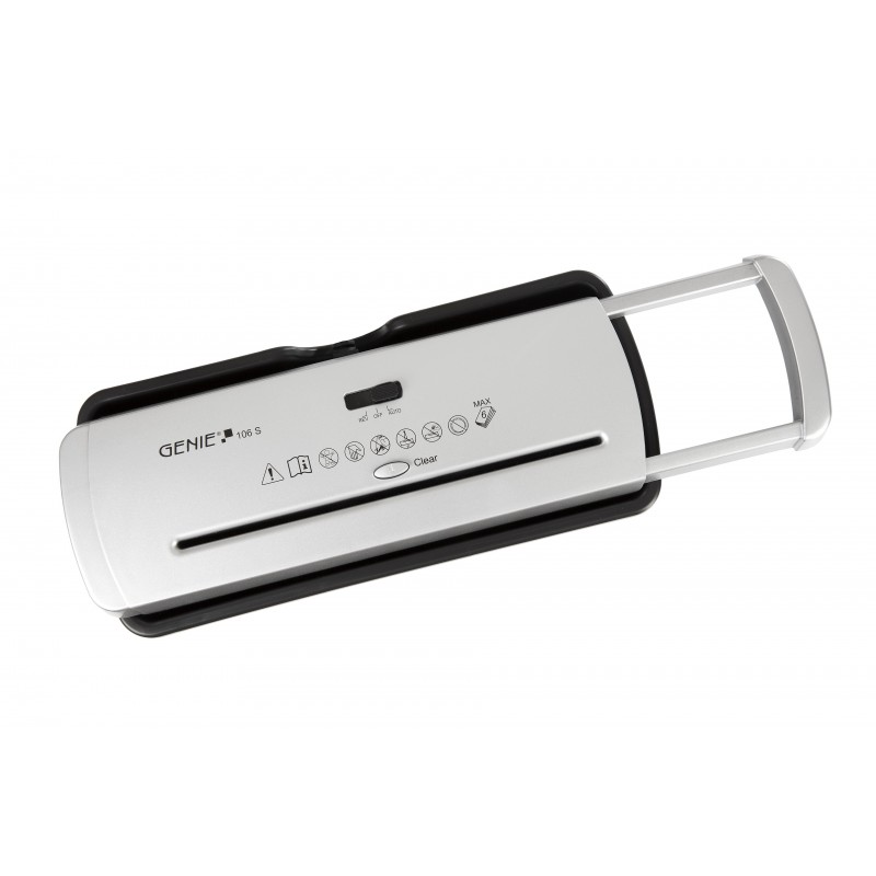 Genie 106 S. Type de déchiquetage: Découpage en bandes, Fente de déchiquetage: 22 cm, Taille de déchiquetage: 6 mm. Consommation électrique typique: 220 W, Tension d'entrée AC: 220 - 240 V, Fréquence d'entrée AC: 50 Hz. Certification: CE. Largeur: 265 mm, Profondeur: 133 mm, Hauteur: 314 mm. Produit par casier principal (externe): 4 pièce(s)