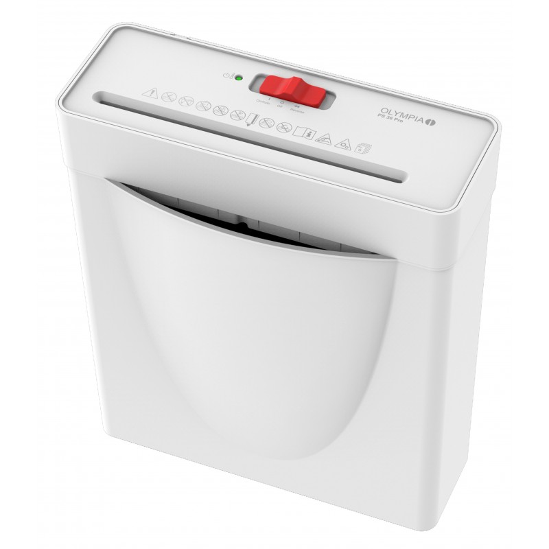 Olympia PS 36 Pro. Type de déchiquetage: Découpage en bandes, Volume du panier: 8 L, Niveau sonore: 72 dB. Tension d'entrée AC: 220 - 240 V, Fréquence d'entrée AC: 50 / 60 Hz, Actuel: 0,8 A. Largeur: 127 mm, Profondeur: 293 mm, Hauteur: 336 mm. Largeur du colis: 140 mm, Profondeur du colis: 307 mm, Hauteur du colis: 324 mm