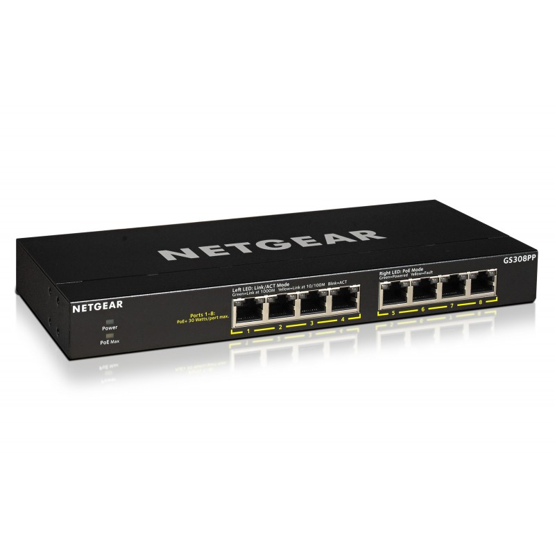 NETGEAR GS308PP. Type de commutateur: Non-géré. Type de port Ethernet RJ-45 de commutation de base: Gigabit Ethernet (10/100/1000), Quantité de ports Ethernet RJ-45 de commutation de base: 8. Full duplex. Répertoire MAC: 4000 entrées, Capacité de commutation: 16 Gbit/s. Standards réseau: IEEE 802.1p, IEEE 802.3, IEEE 802.3ab, IEEE 802.3az, IEEE 802.3i, IEEE 802.3u, IEEE 802.3x. Voltage d'entrée DC: 54 V. Connecteur d'alimentation: DC-in jack. Connexion Ethernet, supportant l'alimentation via ce port (PoE). Montage mural, Grille de montage