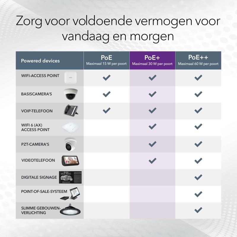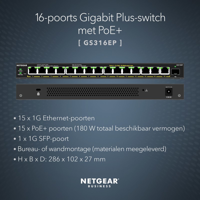 NETGEAR GS316EP-100PES. Type de commutateur: Géré. Type de port Ethernet RJ-45 de commutation de base: Gigabit Ethernet (10/100/1000), Quantité de ports Ethernet RJ-45 de commutation de base: 15. Full duplex. Répertoire MAC: 4000 entrées, Capacité de commutation: 32 Gbit/s. Standards réseau: IEEE 802.3, IEEE 802.3ab, IEEE 802.3af, IEEE 802.3at, IEEE 802.3u, IEEE 802.3x. Connecteur d'alimentation: DC-in jack. Connexion Ethernet, supportant l'alimentation via ce port (PoE)
