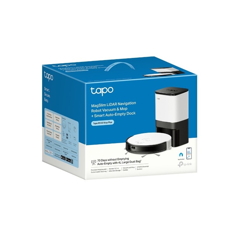 TP-Link Tapo RV20 Mop Plus. Type de conteneur à poussière: Sac à poussière, Couleur du produit: Noir, Blanc, Forme: Rond. Contenance en poussière (total): 4 L, Niveau sonore: 51 dB, Contenance en poussière (aspirateur): 0,35 L. Capacité de la batterie: 2600 mAh, Temps de marche: 180 min, Consommation électrique typique: 45 W. Hauteur: 78,5 mm, Largeur: 342,6 mm, Profondeur: 342,2 mm