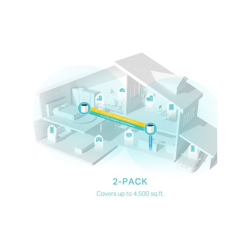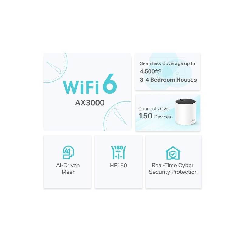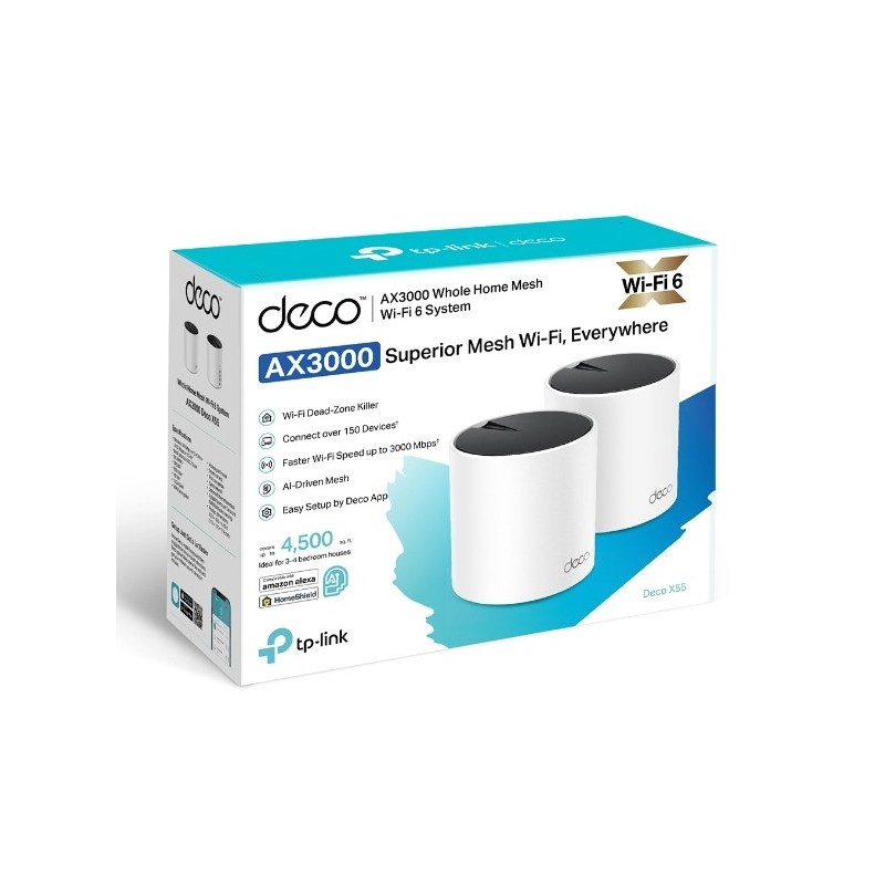 TP-Link DECO X55 (2-Pack). Couleur du produit: Blanc, Type d'antenne: Interne, Type de produit: Routeur maillé. Bande Wi-Fi: Bi-bande (2,4 GHz / 5 GHz), Norme Wi-Fi: Wi-Fi 6 (802.11ax), Débit de transfert des données WLAN (max): 3000 Mbit/s. Fréquence du processeur: 1 GHz, Pare-feu de sécurité: SPI Firewall, Puissance de transmission (CE): 20 - 23 DBm. Certificats de conformité: CE, RoHS, Certification: CE, FCC, RoHS, RCM. Largeur: 110 mm, Profondeur: 110 mm, Hauteur: 114 mm