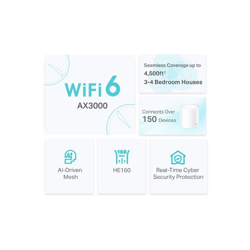 TP-Link Deco X50 (2-pack). Couleur du produit: Blanc, Type d'antenne: Interne, Puissance de transmission: CE: <20 dBm (2.4 GHz) <23 dBm (5 GHz) FCC: <30 dBm (2.4 GHz) <30 dBm (5 GHz). Bande Wi-Fi: Bi-bande (2,4 GHz / 5 GHz), Norme Wi-Fi: Wi-Fi 6 (802.11ax), Standards wifi: 802.11a, 802.11b, 802.11g, Wi-Fi 4 (802.11n), Wi-Fi 5 (802.11ac), Wi-Fi 6 (802.11ax). Fréquence du processeur: 1 GHz, Pare-feu de sécurité: SPI, Fonctions contrôle parental: Profils personnalisés, Contrôles de temps, Rapports hebdomadaires/mensuels. Tension sortie de l'adaptateur secteur: 12 V, Courant de sortie de l'adaptateur secteur: 1,5 A. Certificats de conformité: CE, RoHS