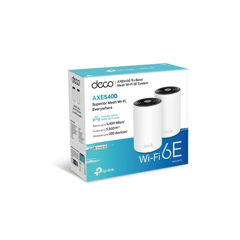 TP-Link Deco XE75. Couleur du produit: Blanc, Type d'antenne: Interne, Couverture maximum: 510 m². Bande Wi-Fi: Tri-bande (2,4 GHz / 5 GHz / 6 GHz), Norme Wi-Fi: Wi-Fi 6E (802.11ax), Standards wifi: 802.11a, 802.11b, 802.11g, Wi-Fi 4 (802.11n), Wi-Fi 5 (802.11ac), Wi-Fi 6 (802.11ax), Wi-Fi 6E.... Fréquence du processeur: 1,7 GHz, Assistant virtuel: Amazon Alexa, Services Cloud pris en charge: TP-Link ID. Largeur: 105 mm, Profondeur: 105 mm, Hauteur: 169 mm. Nombre de produits inclus: 2 pièce(s), Nombre d'unités incluses: 2 pièce(s)