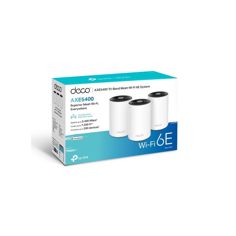 TP-Link Deco XE75. Couleur du produit: Blanc, Type d'antenne: Interne, Couverture maximum: 670 m². Bande Wi-Fi: Tri-bande (2,4 GHz / 5 GHz / 6 GHz), Norme Wi-Fi: Wi-Fi 6E (802.11ax), Standards wifi: 802.11a, 802.11b, 802.11g, Wi-Fi 4 (802.11n), Wi-Fi 5 (802.11ac), Wi-Fi 6 (802.11ax), Wi-Fi 6E.... Fréquence du processeur: 1,7 GHz, Assistant virtuel: Amazon Alexa, Services Cloud pris en charge: TP-Link ID. Certificats de conformité: CE, RoHS. Largeur: 105 mm, Profondeur: 105 mm, Hauteur: 169 mm