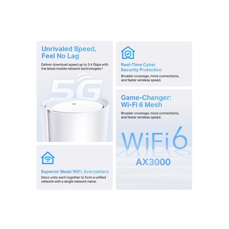 TP-Link Deco X50-5G. Couleur du produit: Blanc, Type d'antenne: Interne, Type de produit: Système maillé. Bande Wi-Fi: Bi-bande (2,4 GHz / 5 GHz), Norme Wi-Fi: Wi-Fi 6 (802.11ax), Débit de transfert des données WLAN (max): 2402 Mbit/s. Génération de réseau mobile: 5G, Norme 4G: LTE-TDD & LTE-FDD. Prise en charge des protocoles réseau (IPv6): IPv4/IPv6. Certification: RoHS, CE, RCM