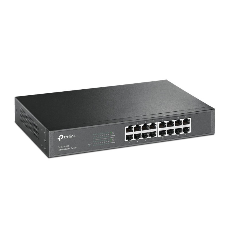 TP-Link TL-SG1016D(UN). Type de commutateur: Non-géré, Banc de commutateurs: L2. Type de port Ethernet RJ-45 de commutation de base: Gigabit Ethernet (10/100/1000), Quantité de ports Ethernet RJ-45 de commutation de base: 16. Full duplex. Répertoire MAC: 8000 entrées, Capacité de commutation: 32 Gbit/s. Standards réseau: IEEE 802.1Q, IEEE 802.1p, IEEE 802.3, IEEE 802.3ab, IEEE 802.3u, IEEE 802.3x. Connecteur d'alimentation: DC-in jack. Grille de montage