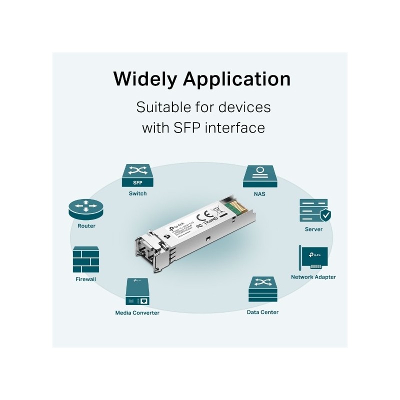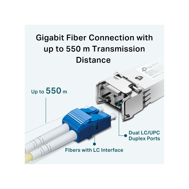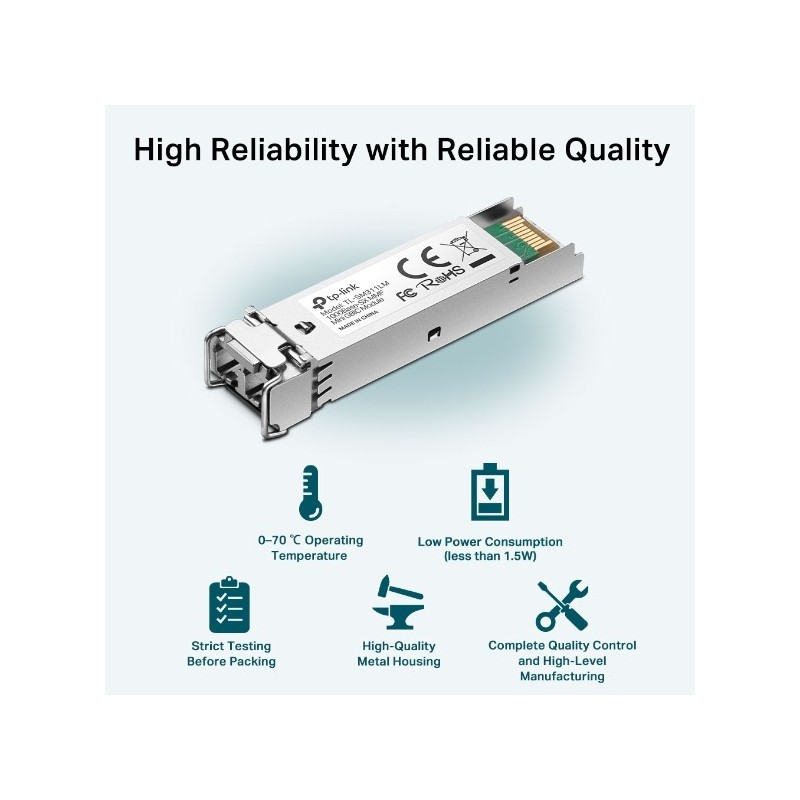 TP-Link TL-SM311LM. Type d'émetteur-récepteur SFP: Fibre optique, Débit de transfert des données maximum: 1250 Mbit/s, Type d'interface: mini-GBIC/SFP. Couleur du produit: Métallique. Tension d'entrée: 3.3 V. Certificats de conformité: RoHS, Certification: FCC, CE. Largeur: 55,4 mm, Profondeur: 13,7 mm, Hauteur: 12,9 mm