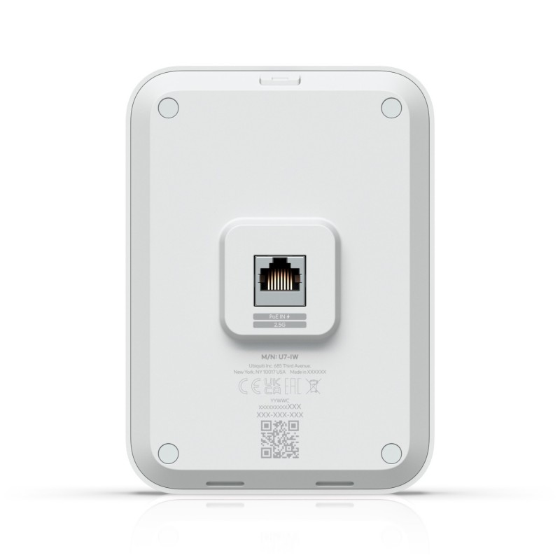 Ubiquiti U7 In-Wall. 2,4 GHz, 5 GHz, Débit de transfert des données maximum: 4300 Mbit/s. Algorithme de sécurité soutenu: PPSK. LAN Ethernet : taux de transfert des données: 2500 Mbit/s. Connexion Ethernet, supportant l'alimentation via ce port (PoE). Couleur du produit: Blanc. Consommation (max): 13 W