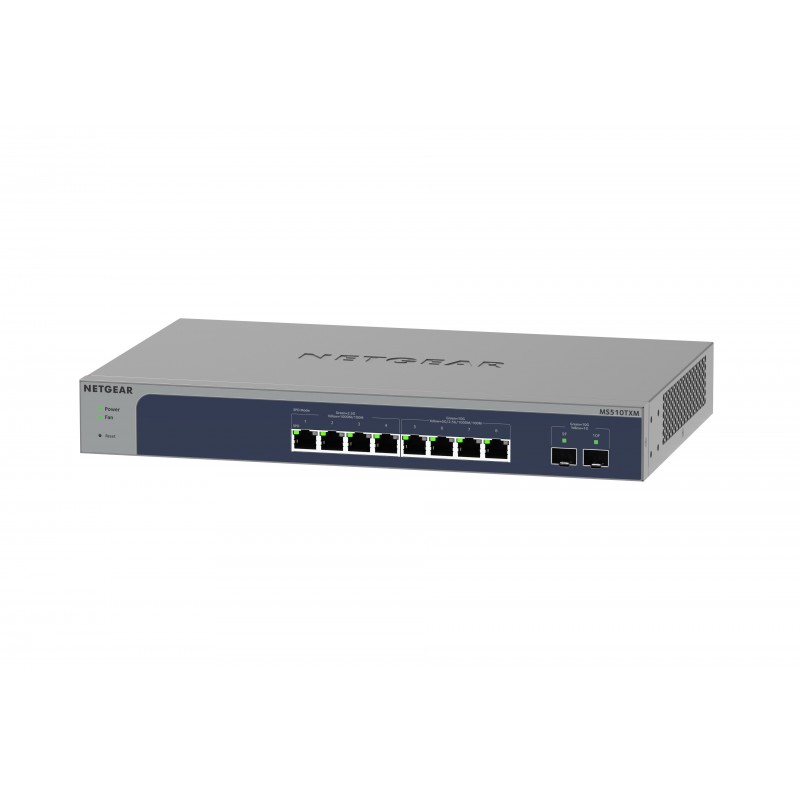 NETGEAR 8-Port Multi-Gigabit/10G Ethernet Smart Switch with 2 SFP+ Ports (MS510TXM). Type de commutateur: Géré, Banc de commutateurs: L2+. Type de port Ethernet RJ-45 de commutation de base: 10G Ethernet (100/1000/10000), Quantité de ports Ethernet RJ-45 de commutation de base: 8. Répertoire MAC: 32000 entrées, Capacité de commutation: 140 Gbit/s. Standards réseau: IEEE 802.1D, IEEE 802.1ab, IEEE 802.1p, IEEE 802.1s, IEEE 802.1w, IEEE 802.1x, IEEE 802.3ad, IEEE.... Grille de montage