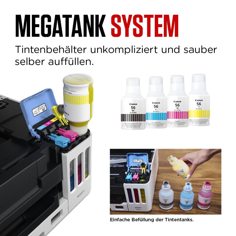 Canon MAXIFY GX6050 MegaTank. Technologie d'impression: Jet d'encre, Impression: Impression couleur, Résolution maximale: 600 x 1200 DPI. Copier: Copie couleur. Numérisation: Numérisation couleur, Résolution de numérisation optique: 300 x 300 DPI. Fonctions recto verso: Copie, Impression. Taille de papier de série A ISO maximum: A4. Wifi. Impression directe. Couleur du produit: Noir, Jaune