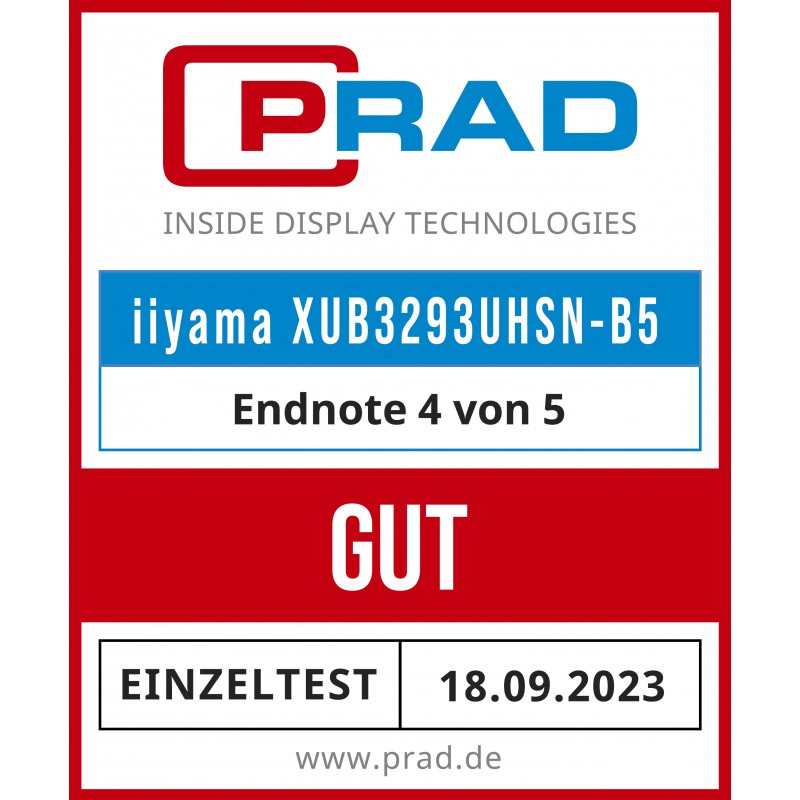 iiyama ProLite XUB3293UHSN-B5. Taille de l'écran: 80 cm (31.5"), Résolution de l'écran: 3840 x 2160 pixels, Type HD: 4K Ultra HD, Technologie d'affichage: LCD, Temps de réponse: 4 ms, Format d'image: 16:9, Angle de vision horizontal: 178°, Angle de vision vertical: 178°. Haut-parleurs intégrés. Concentrateur USB intégré, Version du concentrateur USB: 3.2 Gen 1 (3.1 Gen 1). Montage VESA, Réglage de la hauteur. Couleur du produit: Noir