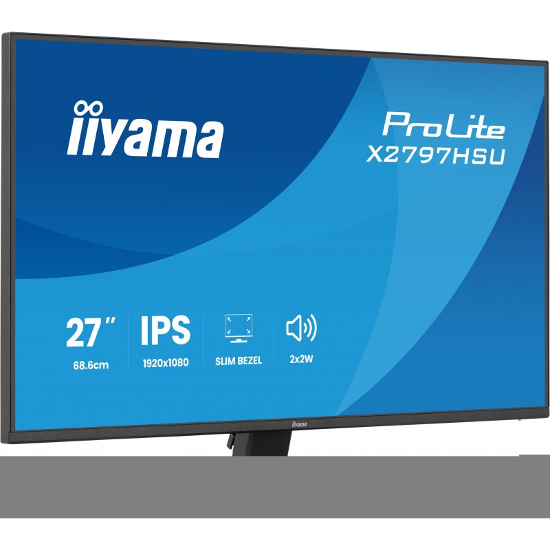 iiyama ProLite X2797HSU-B1. Taille de l'écran: 68,6 cm (27"), Résolution de l'écran: 1920 x 1080 pixels, Type HD: Full HD, Surface d'affichage: Mat, Temps de réponse: 4 ms, Format d'image: 16:9, Angle de vision horizontal: 178°, Angle de vision vertical: 178°. Haut-parleurs intégrés. Concentrateur USB intégré, Version du concentrateur USB: 3.2 Gen 1 (3.1 Gen 1). Montage VESA. Couleur du produit: Noir