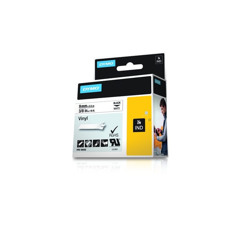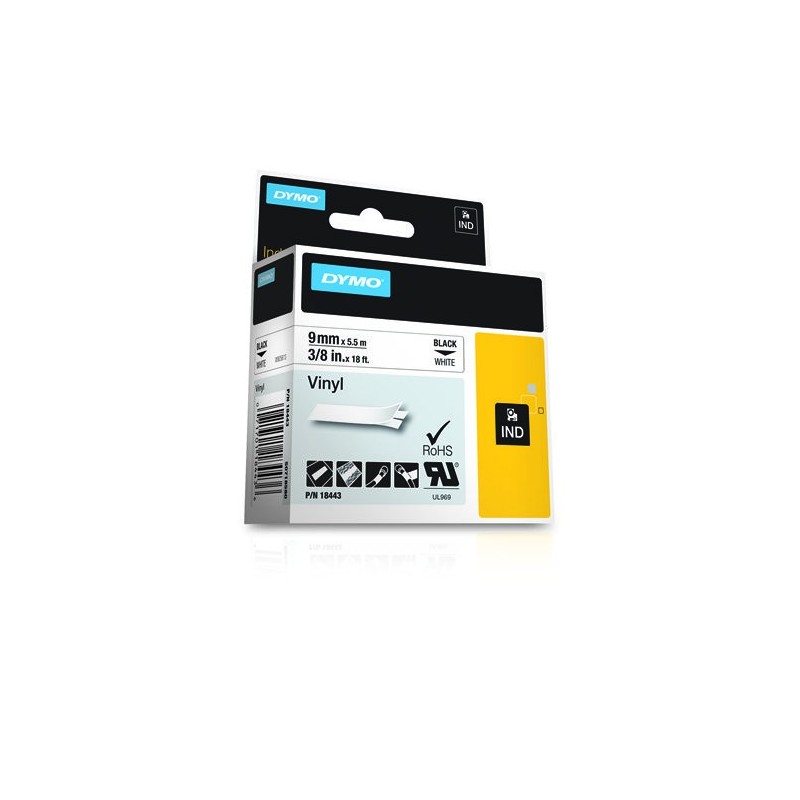 DYMO Étiquettes en vinyle IND. Couleur d'étiquette: Noir sur blanc, Couleur du produit: Multicolore, Matériel: Vinyl. Largeur de la bande: 9 mm, Longueur de la bande: 5,5 m, Type d'emballage: Boîte