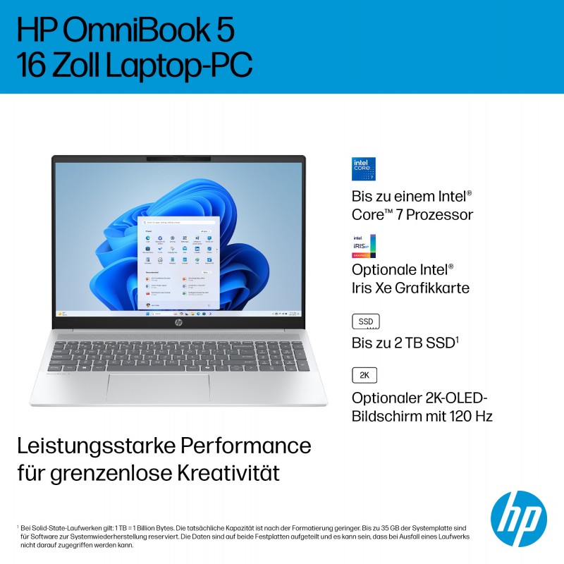 HP OmniBook 5 Laptop 16-ba1153ng. Format: Clapet. Famille de processeur: Intel® Core™ i5, Modèle de processeur: i5-1334U. Taille de l'écran: 40,6 cm (16"), Type HD: 2K, Résolution de l'écran: 1920 x 1200 pixels. Mémoire interne: 16 Go, Type de mémoire interne: LPDDR5x-SDRAM. Modèle d'adaptateur graphique inclus: Intel Iris Xe Graphics. Système d'exploitation installé: Windows 11 Home. Poids: 1,77 kg