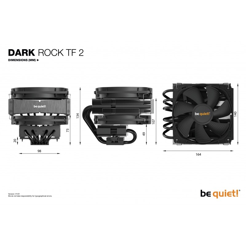 be quiet! Dark Rock TF2 | Ventirad top-flow, socket Intel et AMD. Type: Refroidisseur, Diamètre du ventilateur: 13,5 cm, Vitesse de rotation (max): 1400 tr/min, Type de roulement: Palier à dynamique des fluides (FDB). Largeur: 140 mm, Profondeur: 163 mm, Hauteur: 134 mm. Couleur du produit: Noir